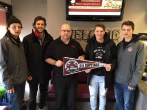 hockey and non-hockey related events. Earlier this week, several members of the Oil Caps were out and about in the community handing out team banners to several local businesses, including Chicken Chef, Comfort Inn, Fountain Tire and Guild Insurance.
