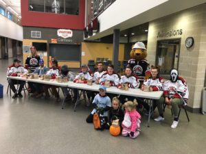 And on Halloween (Tuesday, Oct. 31) Oil Caps players prepared and handed out candy to local kids at the entrance way of Tundra Oil and Gas Place.