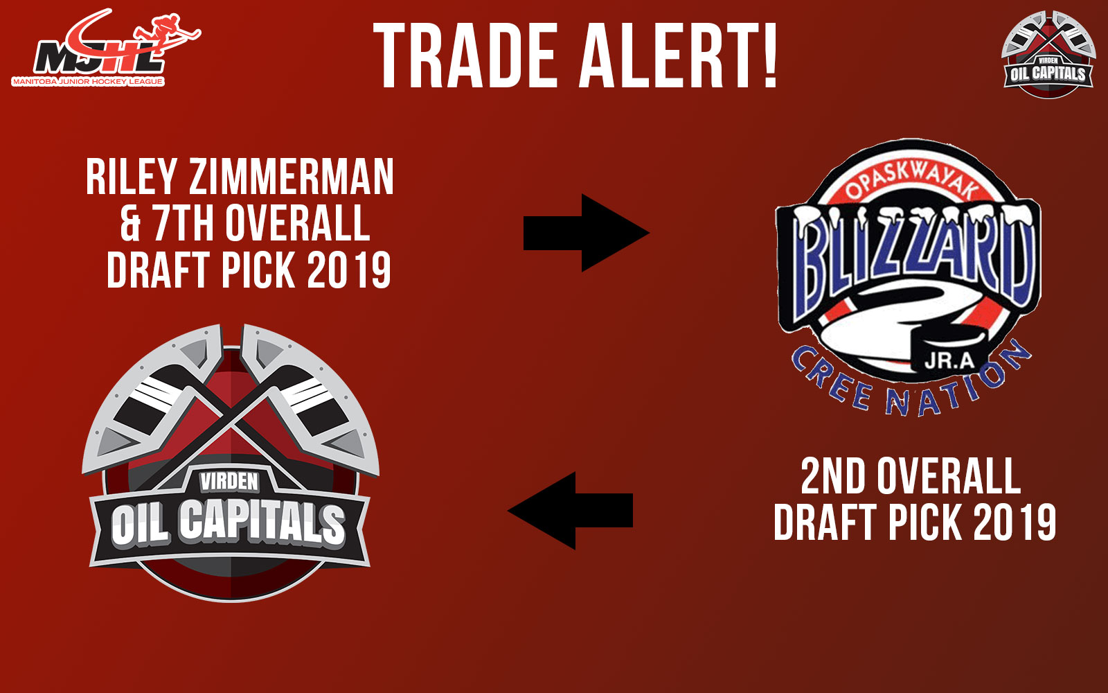 The Virden Oil Caps have traded their 1st round selection (7th overall) and 2002 forward prospect, Riley Zimmerman to the OCN Blizzard for the 2nd overall pick in this year’s MJHL draft. Zimmerman played last season with the Winnipeg Wild in the Manitoba AAA U-18 Hockey League where he had 5 goals and 13 assists in 33 regular season games. The left winger added another 3 points in 11 playoff games for a Wild team that lost in the league final.